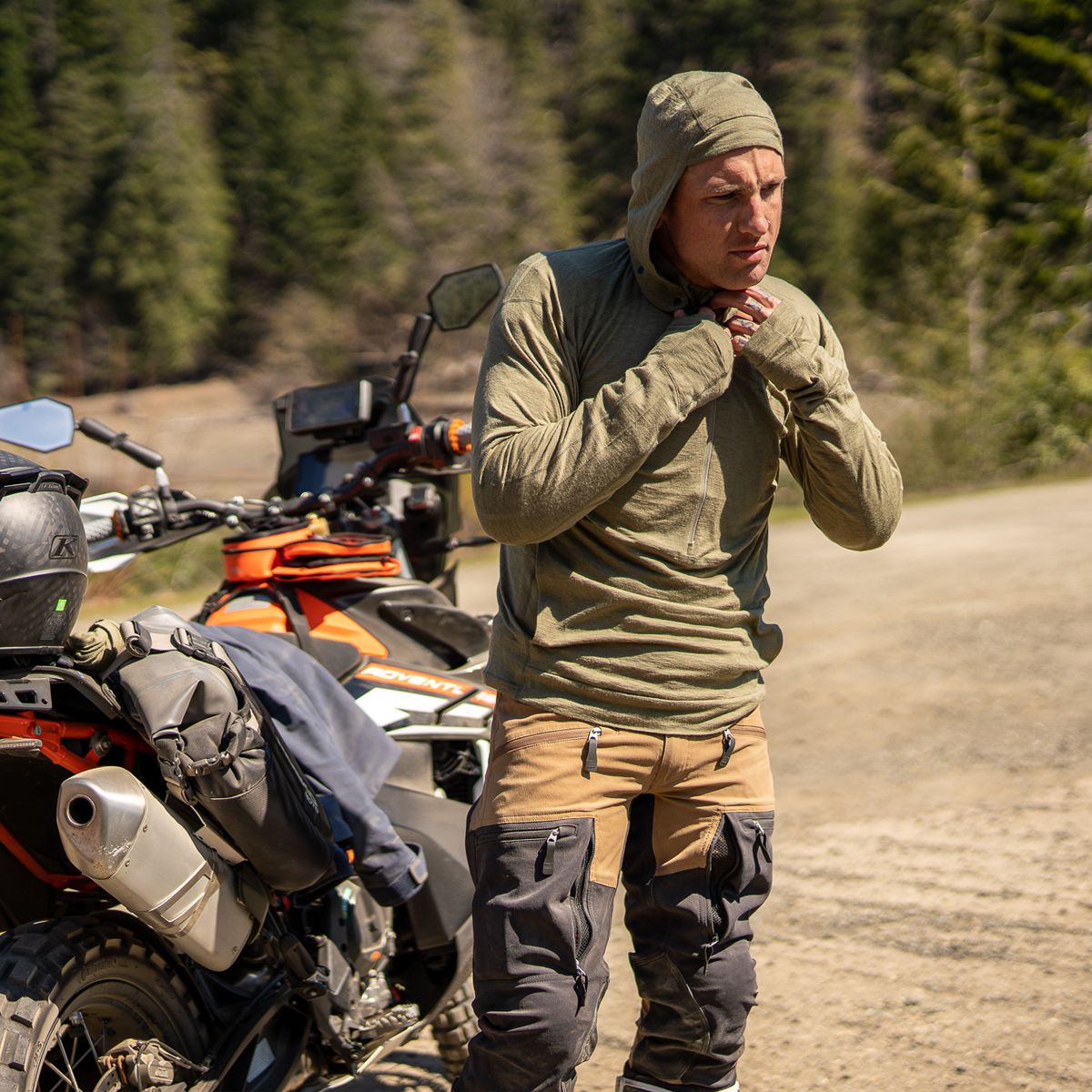 Understated and simple, the Strata Quarter Zip Thermal Top is a travel oriented base layer focused on riding as well as the moments in between. Open up the quarter zip to provide some added ventilation, while fully zipped, the stand collar seals nicely around your neck for additional warmth. Add the removable hood at camp or stash it for the day’s ride. Reinforced thumb loops help to keep the sleeves in place when layering over or under armor. With the combination of technical features and casual styling, this versatile piece is sure to become a close travel companion.