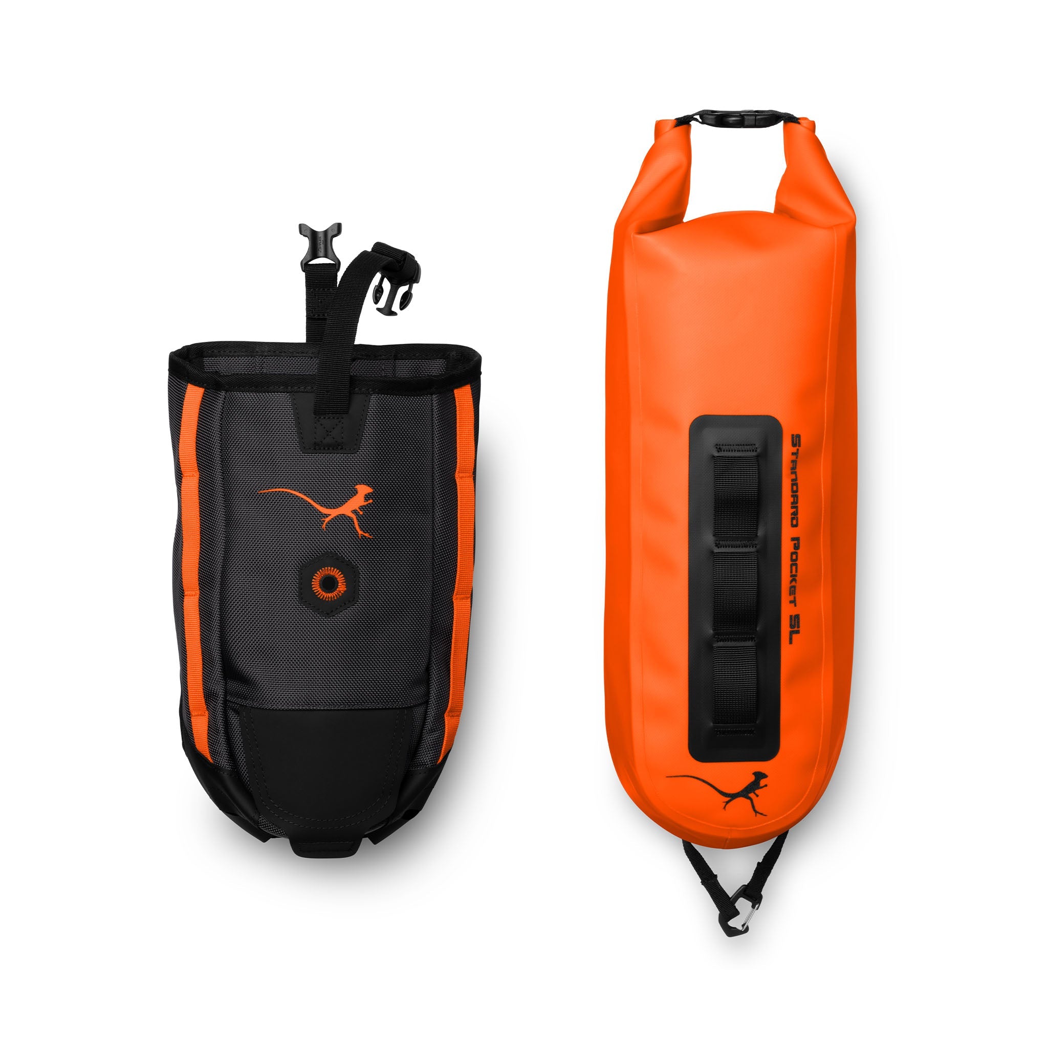 The 5L Aux Pox (V2) mounts on the back and/or front of the Backcountry 35 Pannier, using 5 bolts, washers, and tee nuts. It consists of a harness and a removable, welded-seam, roll-top drybag. The harness can also be used without the included drybag, for things like fuel bottles, a hydration reservoir, or a tool roll. The V2 features velcro closure hatch door for the MSR dromedary nozzle at the bottom of the harness. There's Hypalon armor along the bottom to the edge to protect against abrasion and reflective panels on the outer face for visibility.