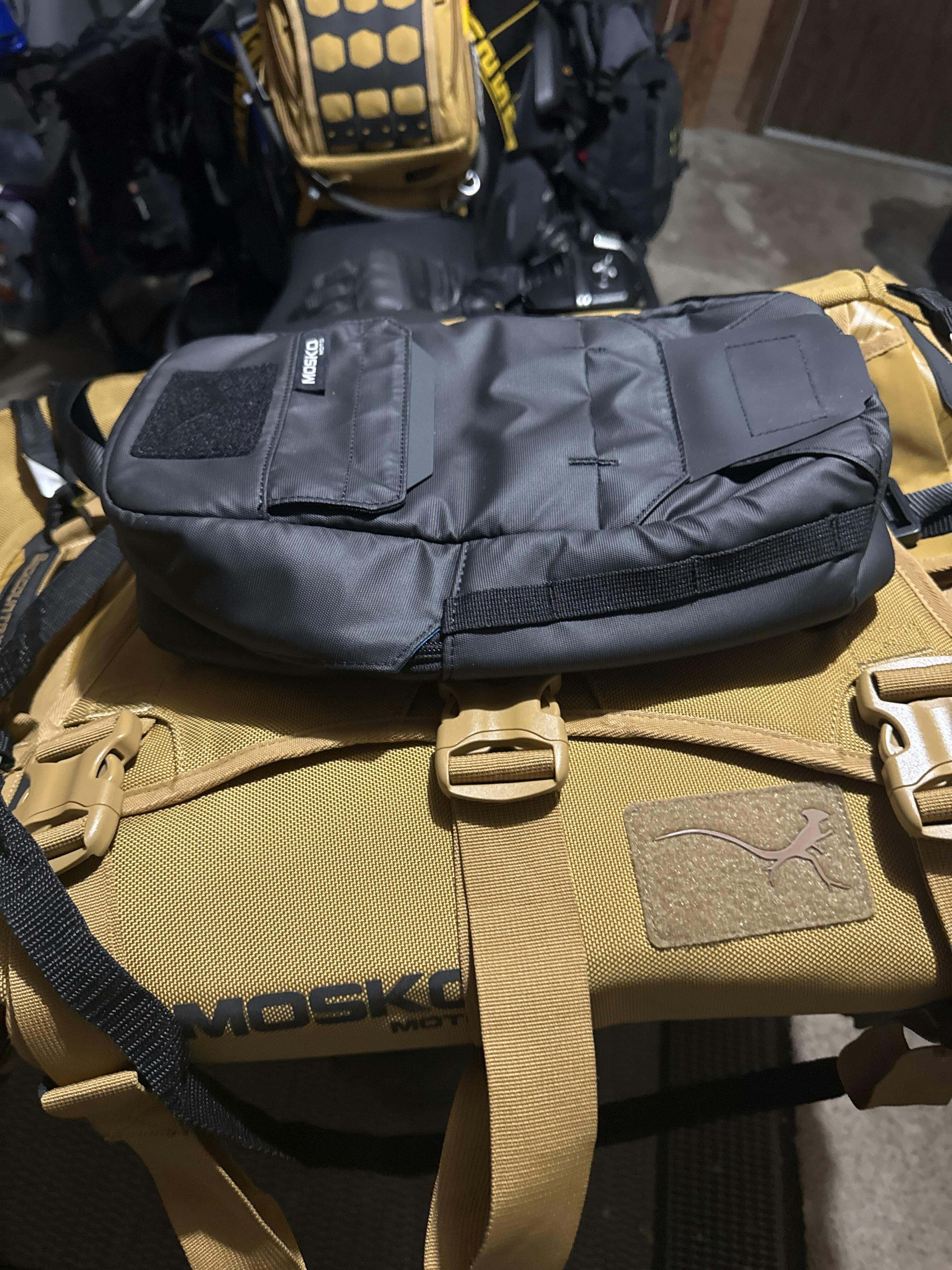 The 5L Aux Pox (V2) mounts on the back and/or front of the Backcountry 35 Pannier, using 5 bolts, washers, and tee nuts. It consists of a harness and a removable, welded-seam, roll-top drybag. The harness can also be used without the included drybag, for things like fuel bottles, a hydration reservoir, or a tool roll. The V2 features velcro closure hatch door for the MSR dromedary nozzle at the bottom of the harness. There's Hypalon armor along the bottom to the edge to protect against abrasion and reflective panels on the outer face for visibility.