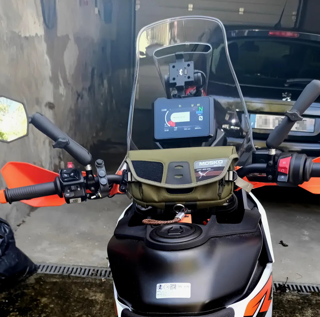 The Gnat Handlebar Bag easily mounts to most motorcycle handlebars using the included Voile straps and is designed to hold small, everyday carry items for fast access like your phone, wallet, sunglasses, ear plugs, charging cables, and trail snacks.