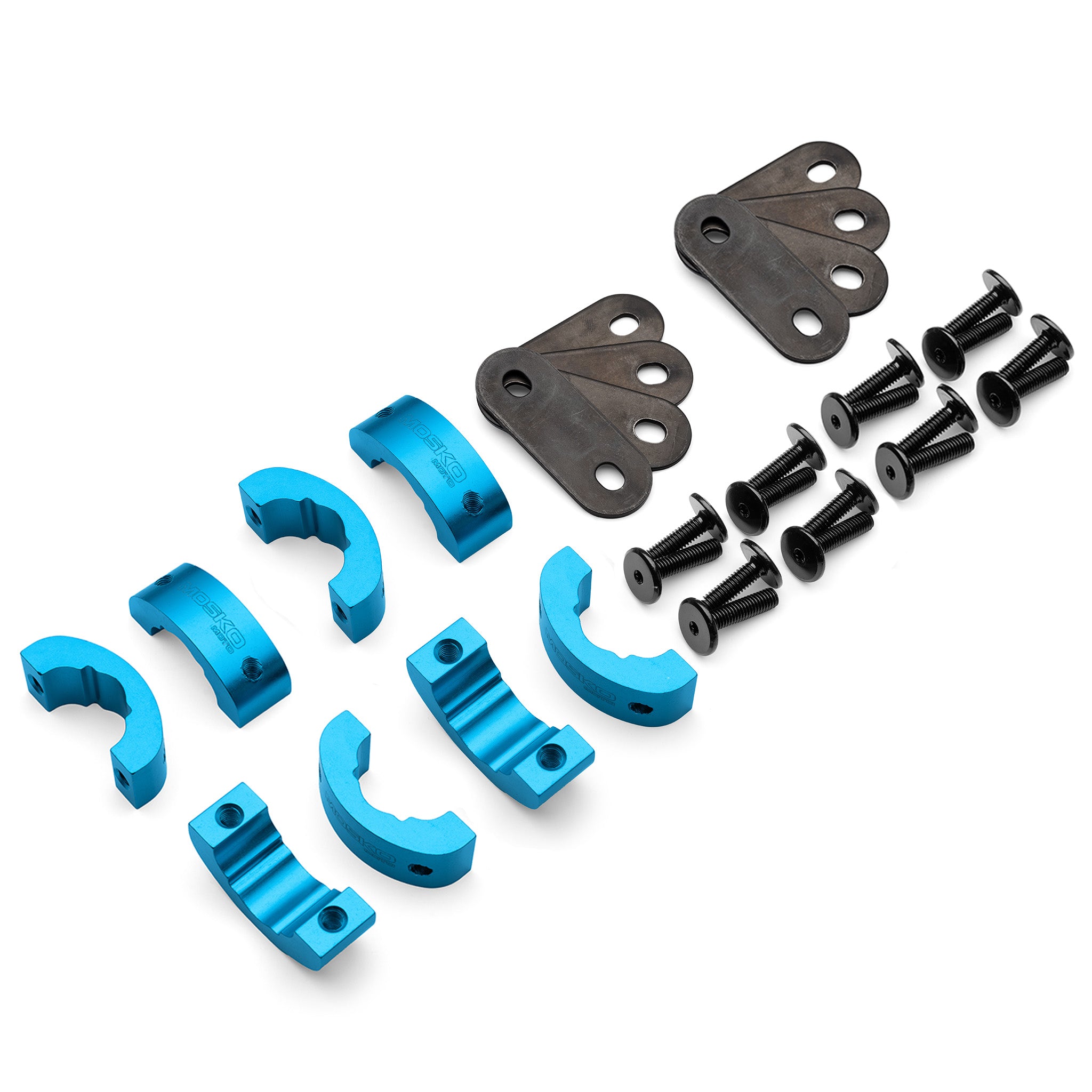 Includes 8 blue anodized aluminum pucks, 8 black oxide treated stainless steel washers, and 16 black oxide treated screws.