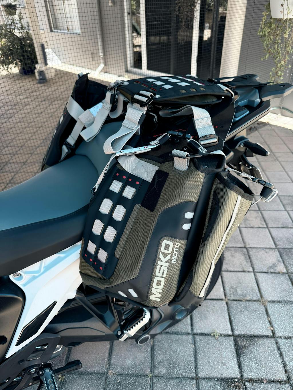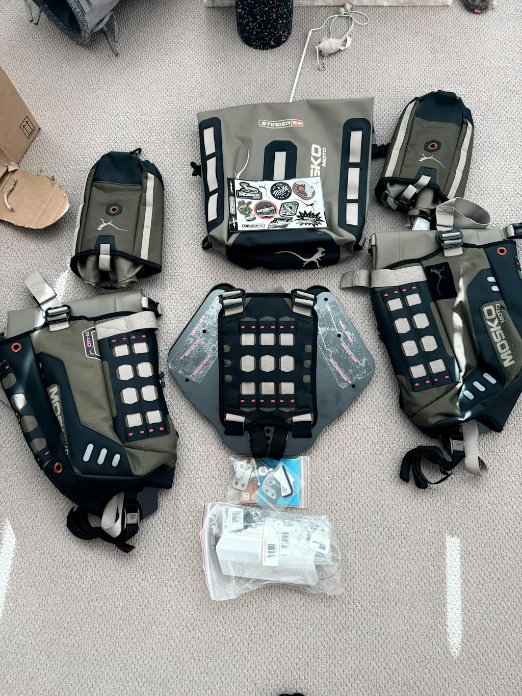 The Reckless 40L is a rackless luggage system that easily mounts on almost any motorcycle. We designed this system for off-road riding, minimalist camping trips, Baja-style hotel-hopping, and loaded day rides. The R40 is 100% waterproof, with five separate removable welded-seam drybags that slide/strap into a protective outer harness.